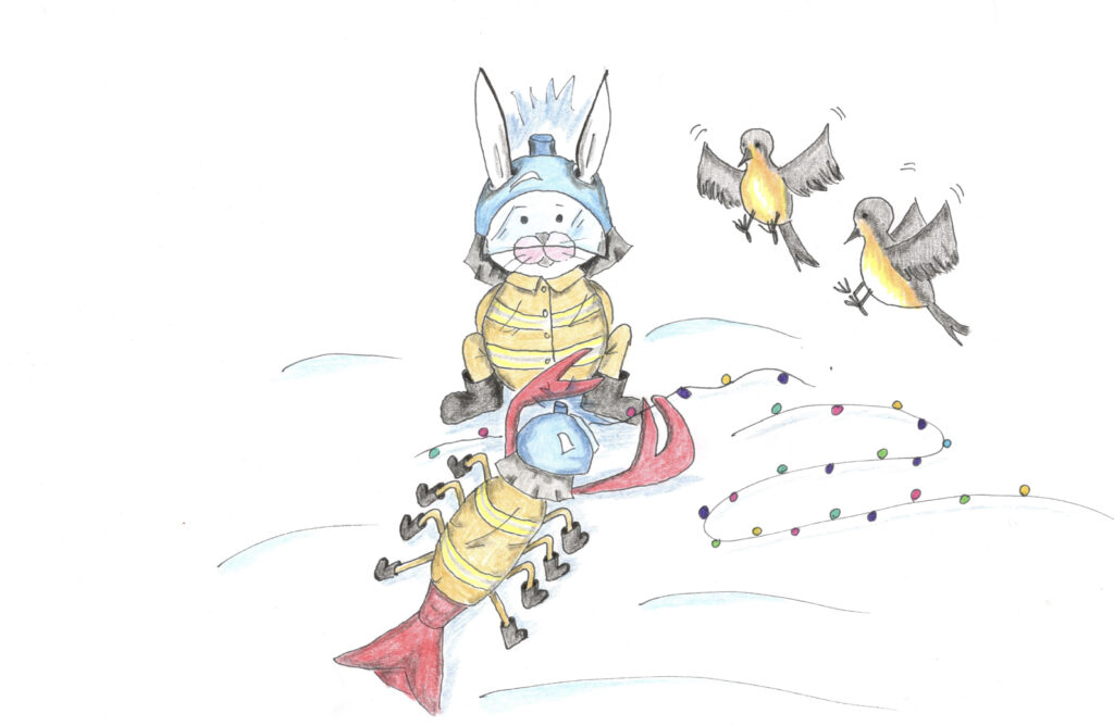 ”Nyt ei auta muu kuin ottaa paikalle Pauke-Palokärki, se saa takoa jäähän reiän, josta ravut pääsevät kyytiin”, Rapid-jänis ajattelee.
