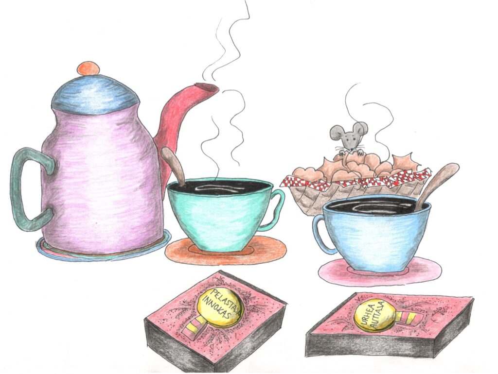 Takametsän Apu-Aseman päällikkö Lepsu-leijona ja apulaispäällikkö Aasi Aargh juovat kansallispäiväkahvia. Lepsu haukkaa juuri voisilmäpullasta, kun Aasi Aargh alkaa puhua.
